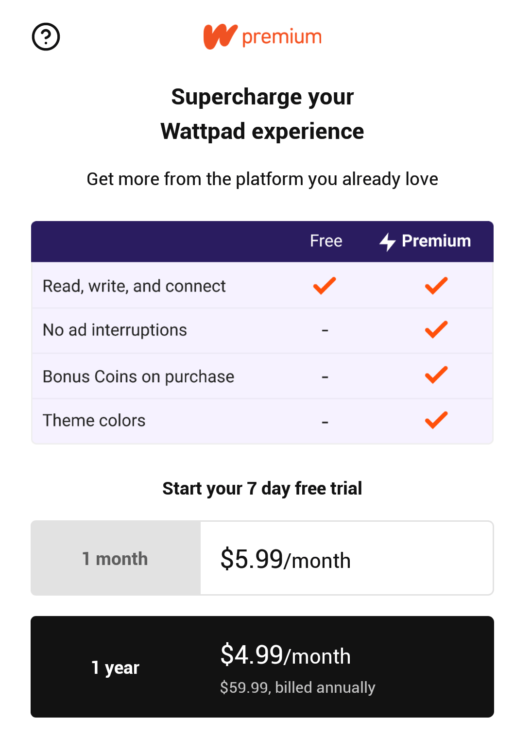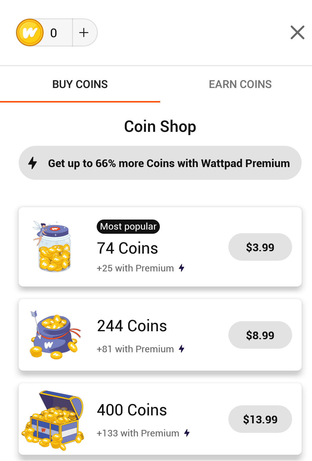 But, wait—there’s more! If you also upgrade to a premium Wattpad account… well then, guess what, you get up to 66% more coins with every coin purchase you make! Which also costs an extra $5.99 a month, or $59.99 a year. Clearly for only the most avid of readers and for Wattpad’s own monetary benefit.