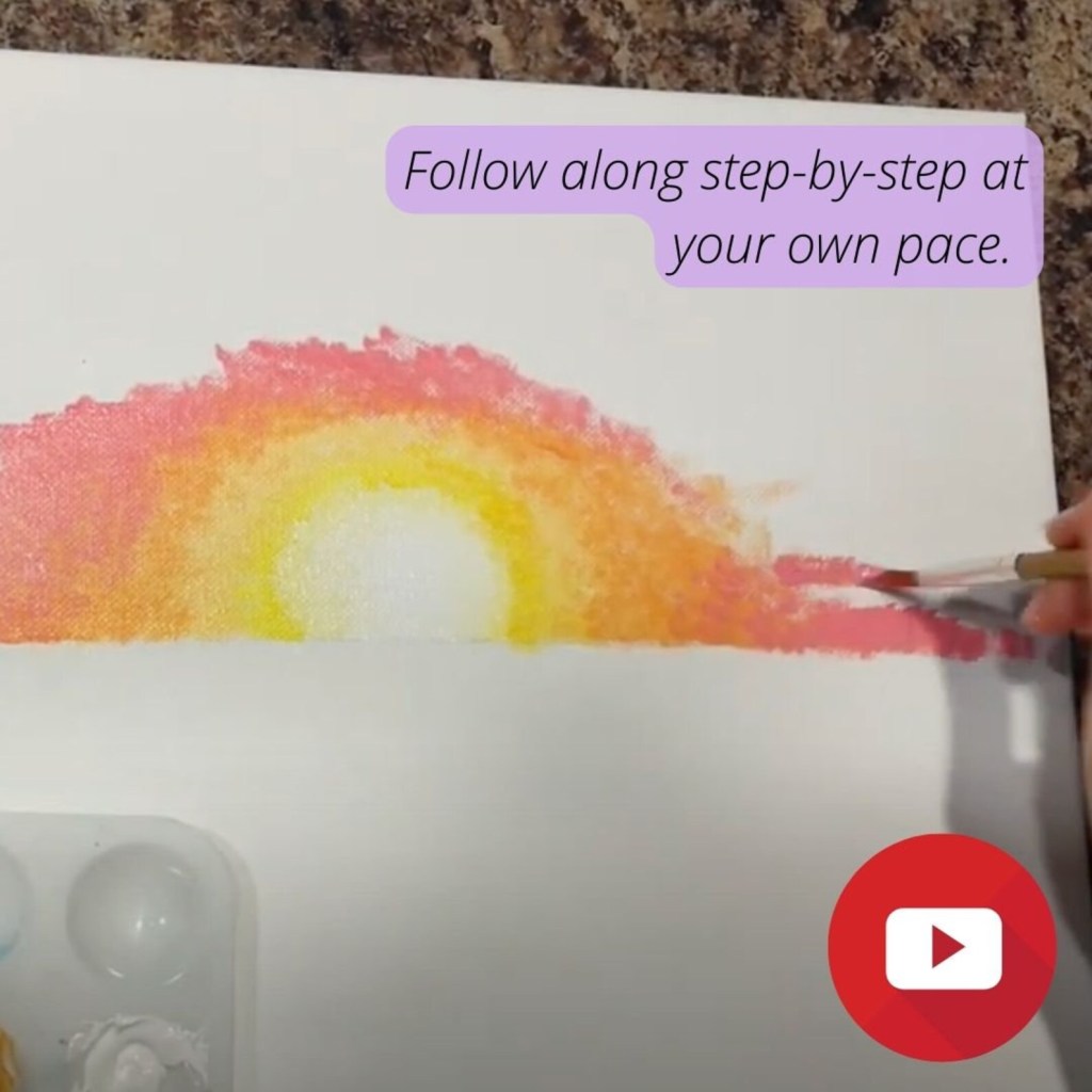 My sunset painting kit/class is perhaps my most popular right now, and I think it’s because it’s a true beginner-friendly painting. I mean, sunsets are, in my opinion, the easiest thing to make because it’s very difficult to mess up; even if you spill your paint over your canvas, you can still blend it all into your sunset. Really!
