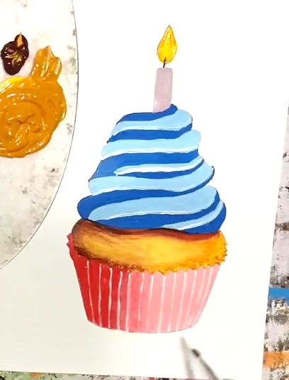 To demonstrate the different between a picture that does not use value and one that does, let’s do a little bit of a side-by-side. To the left, you’ll see a simple digital graphic of a cupcake that does not use any differences in value; to the right, you’ll see a real painting of a cupcake that adds highlights and lowlights for a more realistic effect.