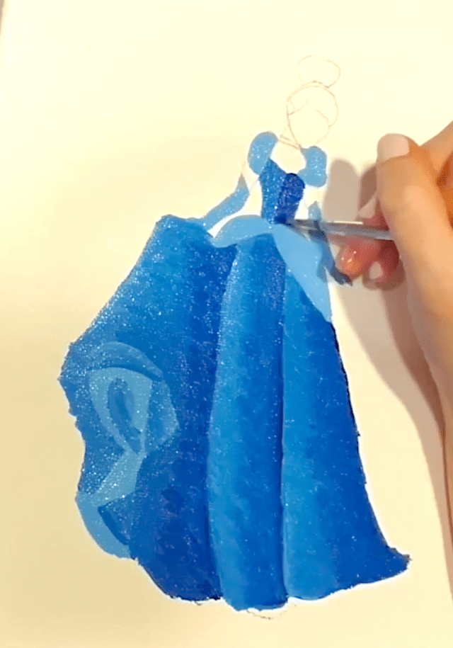 Here’s a snapshot of this method in action. This is taken from my Cinderella painting class on Canvas Academy, and you’ll first see my painting palette with two different highlighted tones of blue being mixed with white before painting. After that, you can see my brush putting those lighter blues into Cinderella’s dress for the highlighted effect.