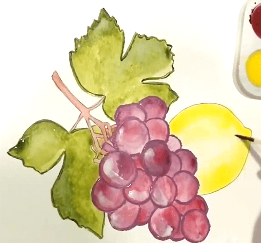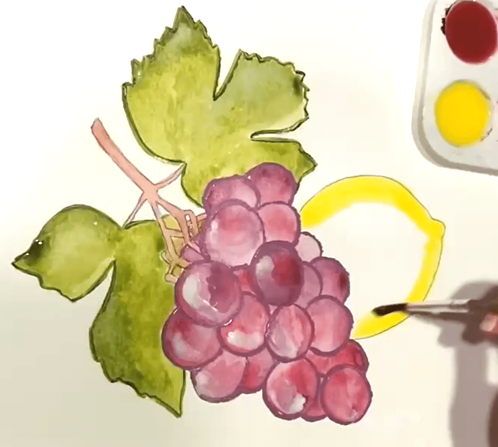 Here’s an example of this method in action, using snapshots from my “Lemony Grape-It!” online watercolor painting class. First, you’ll see a lemon with some dark yellow watercolor lining its edges. Then, you’ll see my brush filling the lemon in with plain water—but notice how the water blends with the yellow already on the page to make an even lighter yellow in the middle of the lemon.
