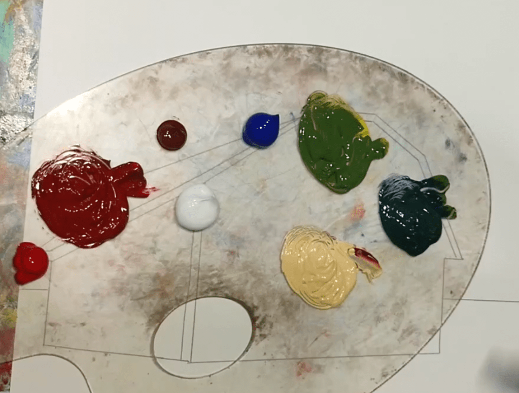 The palette “chart” of colors used to make this painted red barn scene. Notice how only the most prominent colors are on the palette—minor variations in color, like the yellow-green patches of grass were mixed directly on the canvas later on in the painting process.